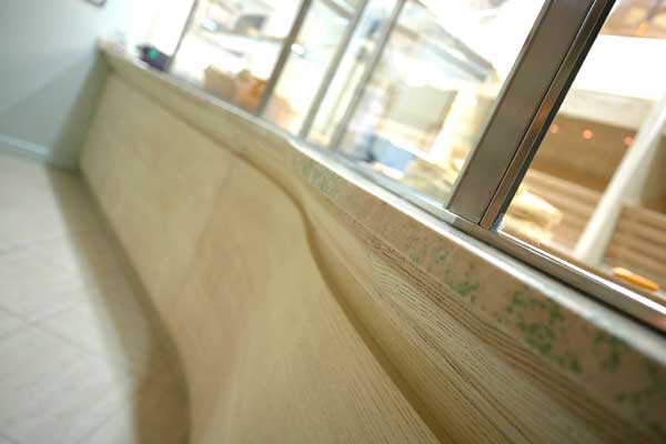 Bancone bar con top in Bianco Carrara sagomato e zoccolino in Verde guatemala |