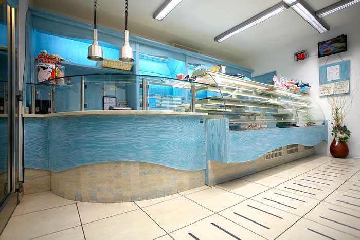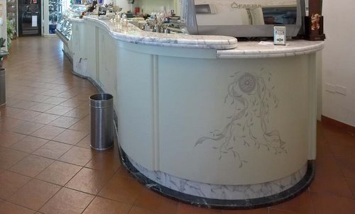 Bancone bar con top in Bianco Carrara sagomato e zoccolino in Verde guatemala |
